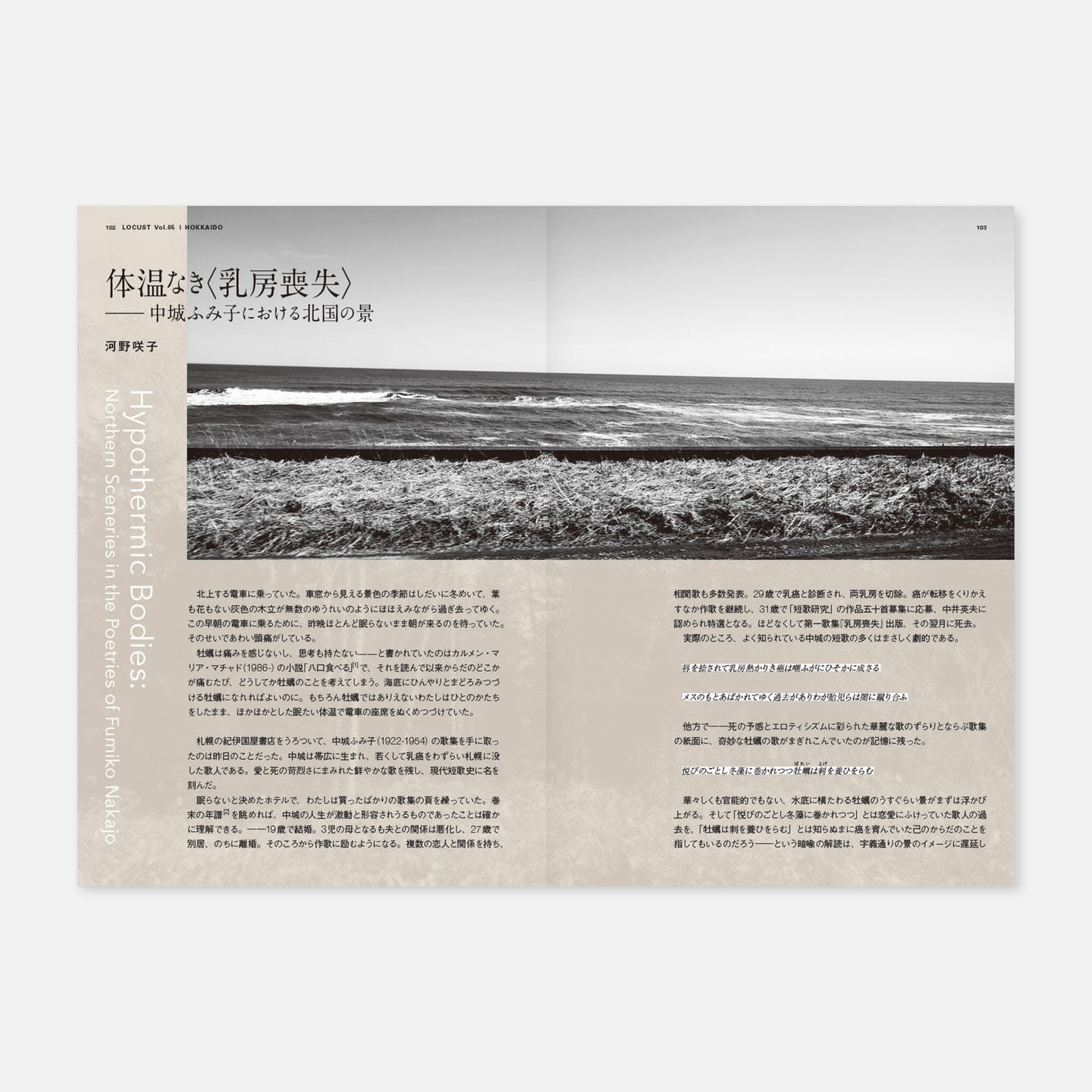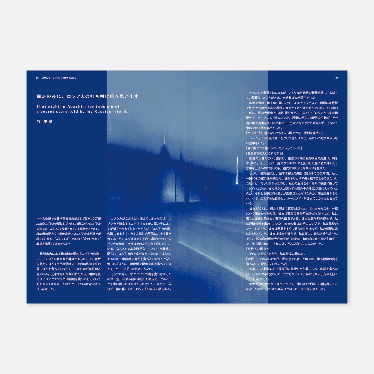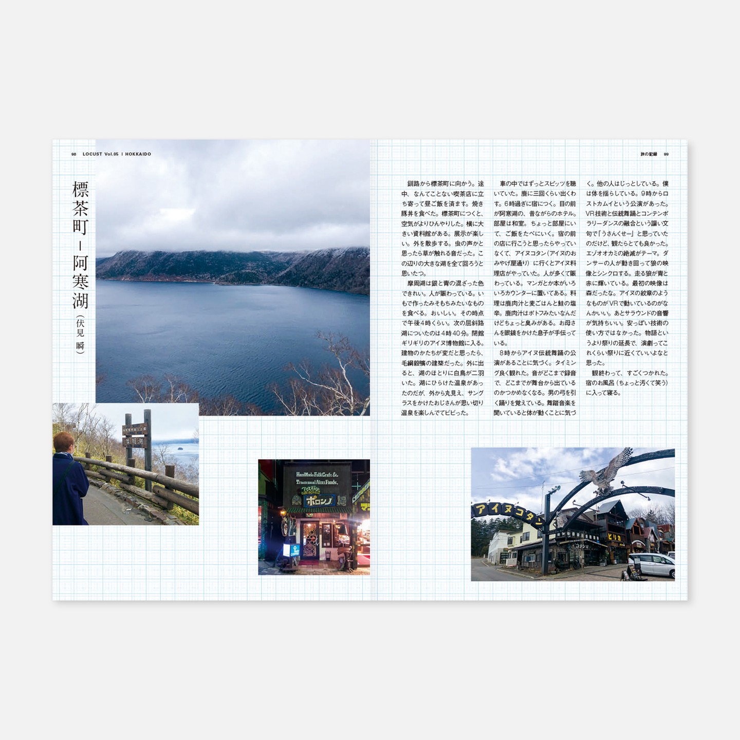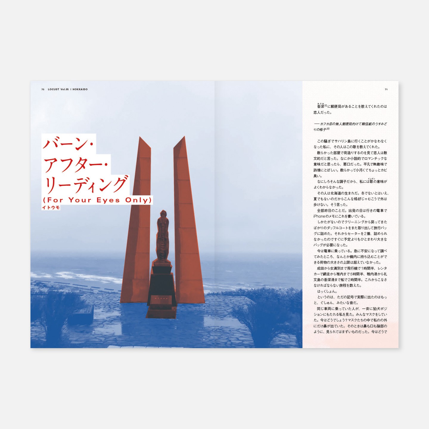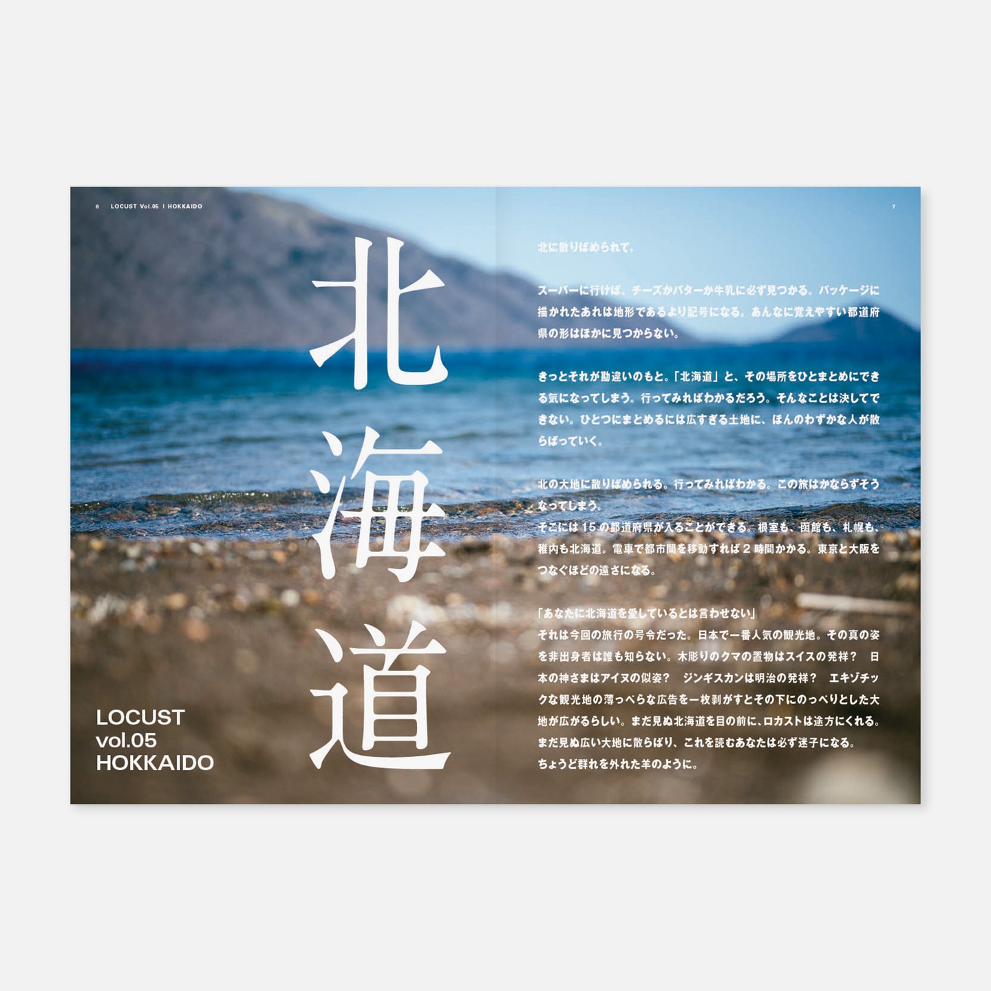 批評旅行誌「LOCUST」の第5号、北海道特集。アートディレクション(というと大層な役割に聞こえるけどデザイナーが一人なだけ)、デザイン、イラストなどを担当。写真は各旅行者=執筆者が撮影したもの。
